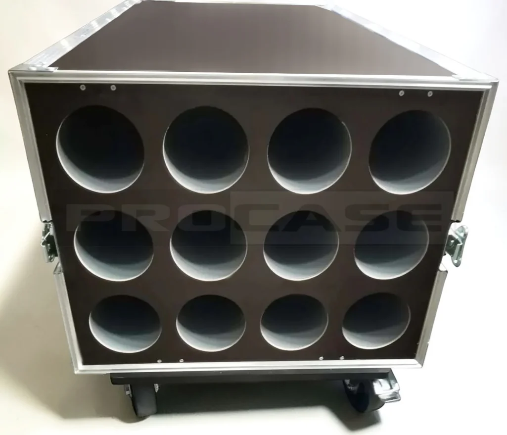 Кейс (кофр) для 12 микрофонных стоек изготавливается из прочной ламинированной фанеры, стенки которого могут быть толщиной 6,5 и 9 мм. (в зависимости от размеров или условий дальнейшего использования). Данный кейс может быть усилен дополнительной защитой в виде ложемента изнутри кейса, а также содержать дополнительные секции согласно вашему техническому заданию и пожеланию.
